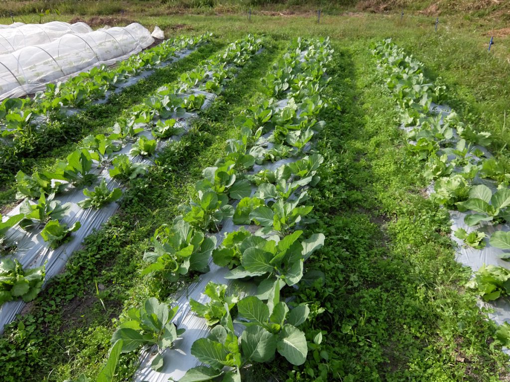 畝でレタスとキャベツを混作して、畝間に白くローバーをはやしておくと、虫害が減って、虫除けネットなしでも出荷できる良品率が80%近くになるという、説(科学論文あり)を信じて、シンダンで試みているのはご存じの通り。本日その景色が出現しました。無事、仮説通りに行きますように。早速、アブラムシがついていたレタスを発見したのは愛嬌か!? 明日、薬かけます(もちろん有機JAS認定の)。